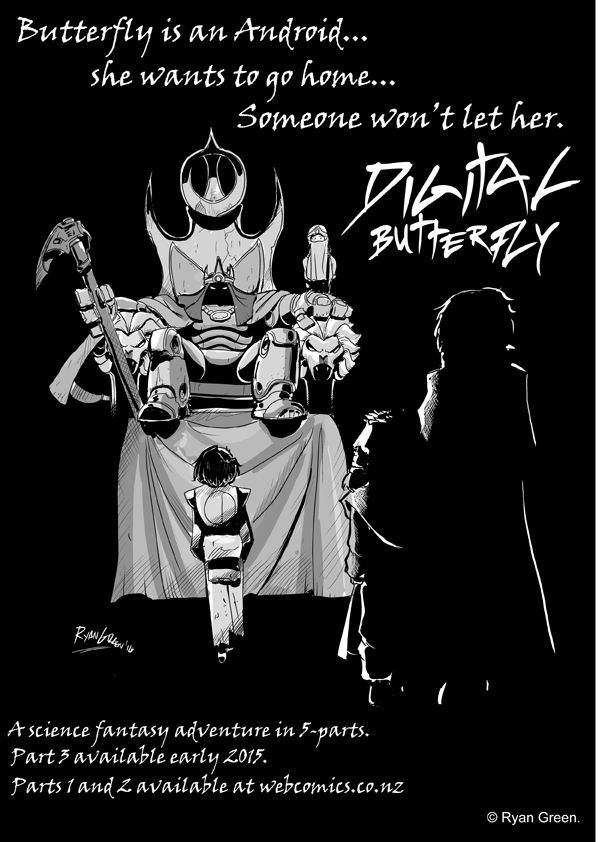 Digital Butterfly 3 and beyond will also appear on the web first. Parts 1 and 2 are on webcomics.co.nz right now (as with the Variant stories) Current print versions are still available. the future of issue by issue editions is still up in the air. When it’s all done, a collected edition is defiantly in the cards and that is my goal with the story. A book to hug and hold (or read if you prefer). One more development: